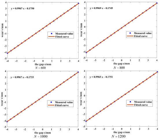 From the above calculations and the fitting equations in Figure 7, it can be seen that the linearity of the fitted curves is 0.28%, 0.21%, 0.20%, and 0.20% and the sensitivities are 0.9967 V/mm, 0.9969 V/mm, 0.9967 V/mm, and 0.9964 V/mm when the number of sampling points is 600, 800, 1000, and 1200, respectively. All are close to 1. This indicates that the system has a good linear relationship between the output and the input and high sensitivity. Therefore, when detecting the wear amount of the grinding wheel, choosing 1000 sampling points can ensure that the system has high linearity and high sensitivity but also has good stability and can obtain a relatively accurate wear amount.