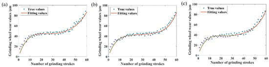 Wear fitting curves: (a) fitted curve for N1; (b) fitted curve for N2; (c) fitted curve for N3.