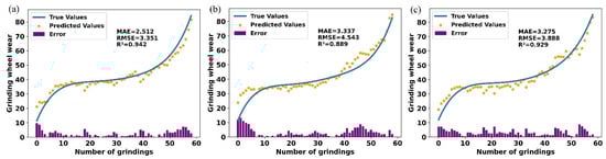 (4) The optimized CBiGRUPE model was experimentally validated using spindle motor current signals, achieving impressive average evaluation metrics: , , and . These results demonstrate the model’s superior prediction accuracy in predicting grinding wheel wear. A detailed comparative analysis of various models highlights their respective advantages and limitations, offering valuable insights for future optimization.