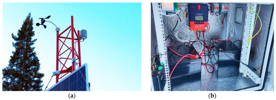 Placement of sensors and probes at the base station: (a) wind sensor and temperature, humidity and pressure sensor; (b) outdoor all-weather cabinet equipment.