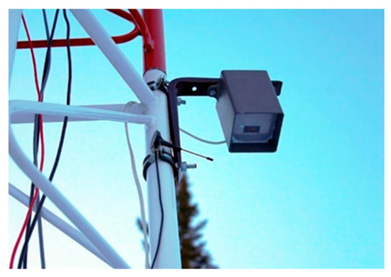 The cabinet itself with the equipment and sensors is mounted on a truss mast structure six meters high. In addition to weather and climate parameters, information on snow cover is important for monitoring and forecasting avalanche danger. The collection of these parameters is provided by snow temperature rods (Figure 3), and a Heltec LoRa 32 microcontroller (Heltec Automation, Chengdu, China) paired with a laser rangefinder installed directly on the base station, which is a receiver of data from snow measuring rods.