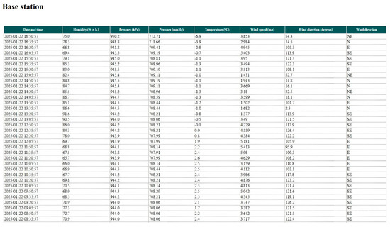 As a result of the operation of the base station and the snow measuring rod, the following data are transmitted to the database every 15 min from meteorological sensors installed at the base station: humidity (% rh); pressure (hPa); pressure (mmHg); temperature (°C); wind speed (m/s); wind direction (Figure 5).
