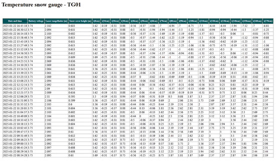 Data from the sensors of the snow measuring rod are also transmitted: battery voltage; laser rangefinder (m); snow cover height (m); temperature from 18 sensors installed on a vertical rod with a 10 cm step (Figure 6).