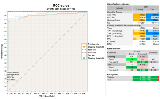 Additionally, the statistical package was used to evaluate the quality of the constructed logistic regression model. Figure 8 shows a graph and corresponding data for the model evaluation. As can be seen from Figure 8, the constructed regression model for predicting avalanches demonstrates high quality, as evidenced by the following indicators: a high AUC-ROC value: 0.9622 for the training set and 0.9505 for the test set (values above 0.9 indicate excellent predictive performance); high recognition accuracy: over 98% for the training set (9082 out of 9229) and the test set (6059 out of 6152).