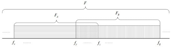 Assume that the same original frequency meter F used by both communication parties A and B is composed of . Before communication at both ends of the link, A and B, respectively, detect and analyze the receiving environment at their own ends to obtain their own good frequencies and form the receiving frequency meters and , respectively, . Among them, contains the frequency , contains the frequency , and the common good frequency of A and B is . When using the symmetrical frequency meter, A and B can only take the frequency within the range of as the common frequency meter. After using an asymmetric frequency meter, is and is . After an information interaction between both parties, radio stations A and B both receive with the local receiving frequency meter and send with the opposite receiving frequency meter [], as shown in Figure 1.