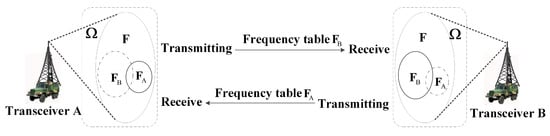 For example, when users A and B communicate, A and B, respectively, detect local good frequencies and form their respective receiving frequency tables and , which are all in the frequency-hopping frequency set F, as shown in Figure 2. In the communication process, A sends with frequency meter and receives with frequency meter ; B sends with frequency meter and receives with frequency meter .