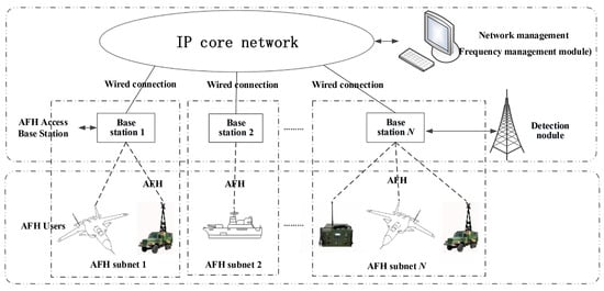 The deployment of AFH technology within HF access networks represents a novel and groundbreaking application, specifically tailored to address the intricate and severe jamming conditions prevalent in such environments. The effectiveness of this application hinges on its capacity to augment the anti-dynamic jamming resilience and adaptability of HF access networks in hostile electromagnetic environments. The network topology is depicted in Figure 3.