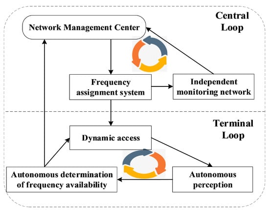 The loop depicted above represents the decision-making allocation loop for detection in an HF access network. At this hierarchical level, frequency resources and frequency quality information undergo centralized processing by the network management center [], a process referred to as “central loop feedback”. Conversely, the lower loop constitutes the terminal’s autonomous sensing decision-making loop, termed “terminal loop feedback”. The dynamic access of the terminal loop is constrained by the allocation results from the central loop, ensuring that frequency resource utilization among base stations does not result in mutual jamming. As illustrated in Figure 4, the terminal loop submits local decision outcomes to the network management center, serving as the reference input for frequency quality information. This approach enhances the accuracy and real-time nature of the frequency quality information source, facilitating more precise decision-making by the frequency distribution system.