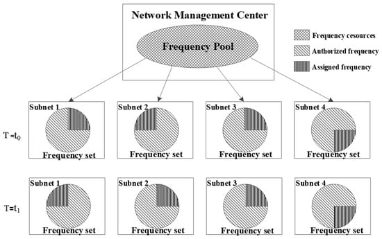 The HF access network utilizing AFH technology adopts a centralized planning and terminal-independent spectrum management approach. The utilization of frequency resources among subnets effectively constitutes a combination of frequency-division multiple access (FDMA), time-division multiple access (TDMA), and space-division multiple access (SDMA). The schematic diagram is depicted in Figure 5.