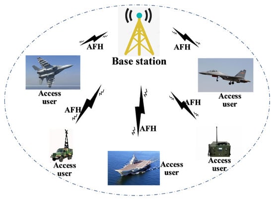 Consequently, the existing literature [,] has proposed the implementation of technology within HF access networks to enhance their link layer’s anti-jamming capacity. Asymmetric frequency hopping (AFH) can be characterized as a multi-task intelligent communication method that integrates frequency-hopping service transmission, jamming perception, transmission quality assessment, and dynamic spectrum access. This is accomplished by leveraging the HF radio’s own equipment and network resources during frequency-hopping service transmission []. This approach encompasses the comprehensive adoption of technologies, such as online autonomous sensing of the electromagnetic environment, analysis and evaluation of frequency-hopping frequency transmission quality, and autonomous asymmetric configuration and dynamic adjustment of authorized spectrum [].