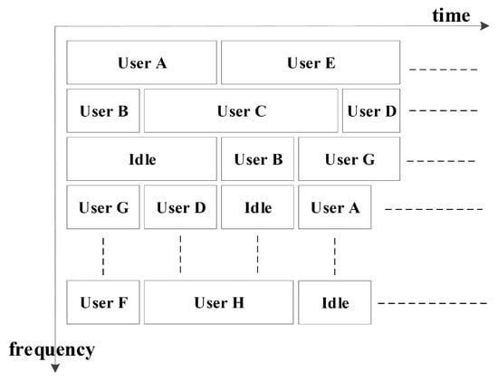 Within the framework of the frequency-hopping star network, there exists the potential for multiple terminals at the base station to communicate with various users. The communication protocols that can be utilized encompass fixed frequency, frequency hopping, and AFH. The effective management and utilization of the network’s spectrum hinge on the implementation of frequency-division multiplexing (FDM) and time-division multiplexing (TDM) of spectrum resources, as illustrated in Figure 7.