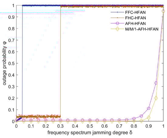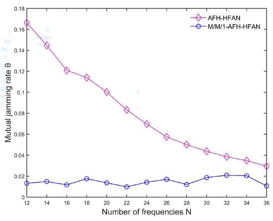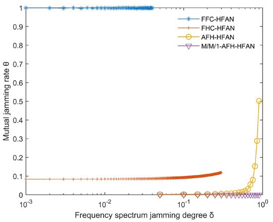 The following can be seen from Figure 10: (1) As increases from 0, the frequency point using fixed-frequency communication suffers jamming. At this time, the user communication is interrupted, and the mutual jamming between this user and other users will not exist. This is because fixed-frequency communication cannot change the communication frequency in real time.