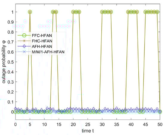 In scenarios where a band comprises frequency points and the electromagnetic spectrum undergoes blocking jamming, the average outage rate of users within the subnet is simulated, as depicted in Figure 8.