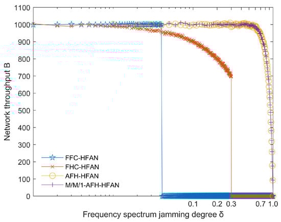 (3) The network throughput achieved through the utilization of AFH remains high and does not begin to decline until the spectrum is severely disturbed. This demonstrates that the network throughput achieved through the utilization of AFH is markedly superior to that attained through the deployment of fixed-frequency hopping and frequency-hopping communication techniques, particularly in the context of heightened electromagnetic spectrum jamming. This is due to the fact that M/M/1-AFH-HFAN is primarily employed to address the issue of mutual jamming between users. The simulation depicted in Figure 12 solely considers the impact of the electromagnetic environment’s jamming degree on the network throughput.