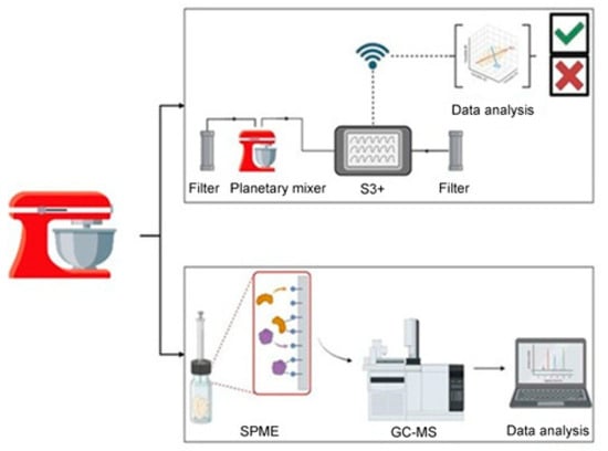 The S3+ device was connected to a planetary mixer using a polyurethane tube, which was inserted through a custom-made hole in the mixer’s closure system (as shown in Figure 2). This setup allowed the internal pump of the S3+ device to continuously draw volatile compounds released by the dough during the entire leavening process and transport them into the sensor chamber. The integration of this sampling system aimed to provide a non-invasive and real-time monitoring approach.