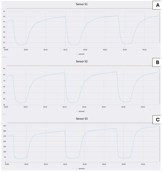 Response curves of the three sensing elements included in the MOS sensor array: (A) SnO2 (sensor 1), (B) SnO2 + Pd (sensor 2), and (C) SnO2 + Au (sensor 3). Each graph shows the electrical resistance (Ω) on the y-axis as a function of time (s) on the x-axis. This curve shows the response to 100 ppm ethanol, a typical fermentation byproduct. The signal profiles reflect the sensor behavior during exposure to clean air followed by ethanol, highlighting the sensitivity and dynamic response of each material.