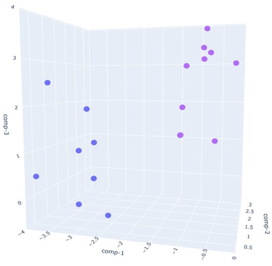 Figure 5. Three-dimensional Linear Discriminant Analysis (LDA) of dough samples prepared with W390 flour in PRE (purple)- and POST (blue)-leavening phases. - In the W250 sample (Figure 6), the separation is also clear, though slightly more dispersed than in the W390 case. The clusters remain non-overlapping, suggesting that the VOC fingerprint evolves noticeably during the fermentation phase, albeit with more heterogeneity than W390. This aligns with the intermediate gluten strength of W250, which allows for moderate elasticity and extensibility, leading to a well-structured yet less tightly controlled VOC development.