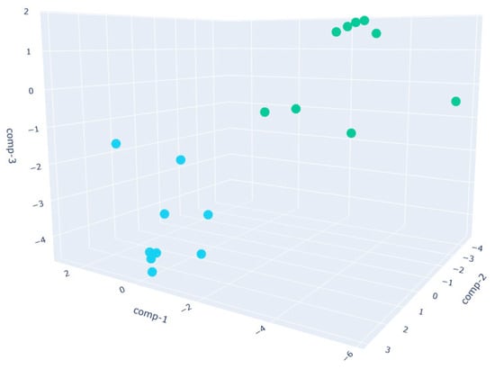 Figure 6. Three-dimensional Linear Discriminant Analysis (LDA) of dough samples prepared with W250 flour in PRE (cyan)- and POST (green)-leavening phases. - The W200 sample (Figure 7) exhibits the greatest intra-class variance among the three flour types, as shown by the broader spread of both PRE and POST clusters.This higher signal dispersion observed in W200 samples may be attributed to the intrinsic variability of weaker flours during fermentation. However, sensor-related variability was minimized through baseline normalization, and environmental parameters were kept as constant as possible throughout the trials. Nevertheless, a clear distinction between the two phases is still observed. This broader dispersion may be attributed to the lower gluten content and reduced gas-holding capacity of weaker flours, which can result in less consistent fermentation dynamics and a more variable VOC output. These observations are supported by literature indicating that weaker flours exhibit faster fermentation onset but less stable leavening behavior, with VOC production being highly sensitive to environmental parameters such as humidity and temperature [].