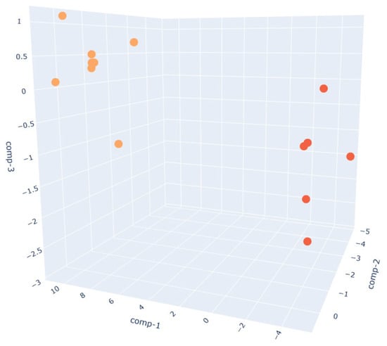Figure 7. Three-dimensional Linear Discriminant Analysis (LDA) of dough samples prepared with W200 flour in PRE (orange)- and POST (red)-leavening phases. LDA clustering reflects VOC mixture variations; each cluster position correlates specific patterns of VOCs, as confirmed by the GC-MS analysis.
