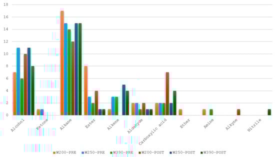 Number of compounds (y-axis) divided into chemical classes (x-axis) present in PRE- and POST-leavening doughs made with flours W200, W250, and W390.