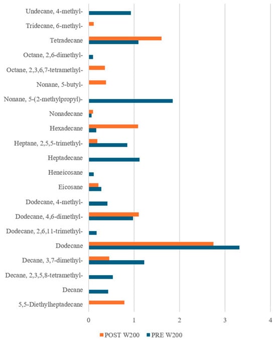 Alkane Compounds in dough samples made with flour of W200, PRE- (blue bars) and POST-leavening (orange bars).