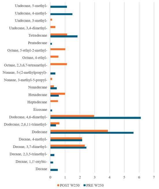 Alkane Compounds in dough samples made with flour of W250, PRE- (blue bars) and POST-leavening (orange bars).