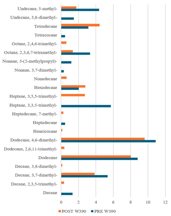 Alkane Compounds in dough samples made with flour of W390, PRE- (blue bars) and POST-leavening (orange bars).