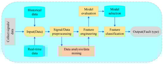 With the comprehensive advancement of industrial digital intelligence transformation, various industrial software and algorithms based on industrial big data have been integrated into industrial products and systems, subsequently giving rise to data-driven fault diagnosis methods for industrial equipment. This has attracted numerous scholars and enterprises to jointly develop fault diagnosis methods suitable for different types of industrial equipment. Figure 1 illustrates the data-driven fault diagnosis process for industrial equipment, primarily encompassing data acquisition and processing, feature extraction, model selection, and feature classification.