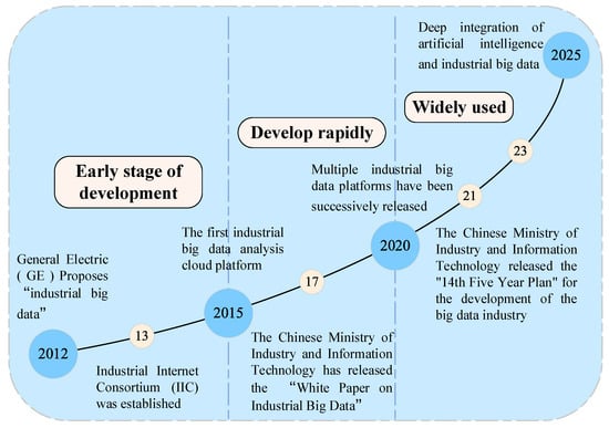 In the Chinese market, industrial big data platforms have also achieved significant progress. In 2017, Alibaba launched the “Industrial Brain”, employing cloud computing and artificial intelligence to optimize manufacturing processes and equipment management. In 2018, Huawei released the FusionPlant platform, which supports data collection, processing, and analysis, thus aiding intelligent manufacturing and equipment fault diagnosis. Meanwhile, at its industrial automation forum, ABB announced that its latest industrial IoT platform—ABB Ability []—is officially live on Huawei Cloud. The continual updates of industrial big data platforms both at home and abroad highlight the irreplaceable role of data-driven industrial equipment fault diagnosis in the digital intelligence transformation of industry. Figure 2 presents the major milestones in the evolution of industrial big data.