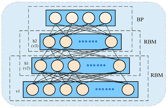 Proposed by Hinton et al. in 2009, a Deep Belief Network (DBN) is a hybrid probabilistic generative model. It can be viewed as a combination of multiple Restricted Boltzmann Machines (RBMs) []. A commonly used DBN architecture is illustrated in Figure 4, where a BP (BackPropagation) network is typically added in the final layer as a classifier []. The hidden layer states of one RBM serve as the visible layer inputs for the next RBM. Unlike traditional machine learning approaches, DBN-based diagnostic models can be trained by pre-training a stack of RBMs to automatically learn high-level features from input data. By directly leveraging raw signals or spectra, these models enable the construction of end-to-end intelligent diagnostic systems, thereby reducing dependence on expert experience and domain knowledge.