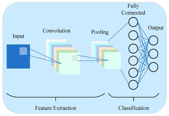 Convolutional Neural Networks (CNNs) first appeared in the LeNet model proposed by LeCun, specifically designed for data with a grid-like topology. Since then, CNNs have demonstrated remarkable power in image processing, leading to various CNN-based models such as VGGNet [], GoogleNet [], and ResNet []. A typical CNN architecture consists of three primary components: convolutional layers, pooling layers, and fully connected layers. Its defining features include local receptive fields and parameter sharing. Figure 5 illustrates the main structure of a CNN.