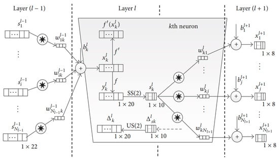 By employing local receptive fields and weight sharing, CNNs can handle large-scale data with fewer parameters, which is advantageous for processing high-frequency vibration signals. Ince et al. [] applied a one-dimensional CNN directly to input signal samples obtained from motor current, enabling rapid and accurate detection of early motor bearing faults. This approach circumvents the manual feature extraction steps typically needed for varying operational conditions. Specifically, the authors used an adaptive one-dimensional CNN for both feature extraction and fault detection from raw motor current signals. The adaptive 1D CNN structure allows for handling input layers of arbitrary dimensions, as illustrated in Figure 6. Furthermore, the proposed compact CNN incorporates hidden neurons in convolutional layers that can perform both convolution and subsampling operations. Because of this fusion, the convolution and subsampling layers are referred to collectively as “CNN layers”, while the remaining layers are still termed “MLP layers”. Consequently, a one-dimensional CNN can be summarized as comprising an input layer, hidden CNN layers, MLP layers, and an output layer. Compared with traditional two-dimensional CNNs, the proposed one-dimensional CNNs exhibit further structural differences. The primary distinction lies in the use of one-dimensional arrays for kernels and feature maps instead of two-dimensional matrices. Consequently, operations such as 2D convolution and lateral rotation are replaced by their one-dimensional counterparts, namely 1D convolution and reverse operations. In one-dimensional CNNs, the kernel size and subsampling parameters are now scalar values. However, the multilayer perceptron (MLP) layers remain consistent with their two-dimensional counterparts, thus preserving the same conventional BP formulations.
