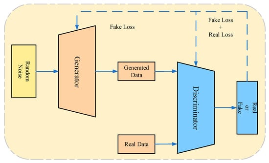 Generative Adversarial Networks (GANs) were first introduced by Goodfellow et al. in 2014 []. As an unsupervised learning algorithm, GANs enable two independent neural networks to train in an adversarial manner. The general GAN architecture includes a generator G and a discriminator D. The generator G aims to capture the input data’s distribution, training G to maximize the probability that D makes a wrong judgment; the discriminator D estimates whether a sample comes from the training data rather than from G, training D to differentiate whether the sample was generated by G. Figure 9 depicts this process. GANs provide an excellent generative model that does not rely on prior knowledge or assumptions about data distribution, instead using maximum likelihood estimation to model the data. In practical applications, numerous GAN variants exist, such as Deep Convolutional GAN (DCGAN), Conditional GAN (CGAN), and Auxiliary Classifier GAN (ACGAN) [].