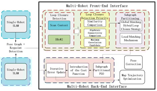 Compared to the rapid development of single-robot SLAM, the field of multi-robot SLAM still faces many unresolved challenges. Currently, research on multi-robot collaborative SLAM primarily focuses on extending single-robot SLAM algorithms, with researchers emphasizing aspects such as inter-robot communication, cooperative localization progress, operational efficiency, and map consistency [1,2]. Multi-robot systems, owing to their efficient collaboration, strong generalization capabilities, and flexible reconfigurability [3], have been widely applied in areas such as field search and rescue, area coverage, and environmental exploration [4]. During the execution of these tasks, collaborative simultaneous localization and mapping (CSLAM) is crucial. With the aid of CSLAM techniques, robots are able to cooperatively estimate their own poses and construct a global map in large-scale unknown environments, which is of great significance for enhancing the autonomy and intelligence of multi-robot systems [5].
