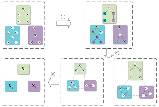 As shown in Figure 2, the process begins with a node matching mechanism. In the first step, based on the evaluation function described in Section 3.1.1, highly coupled nodes are identified and matched, as represented by the black solid lines in the figure.