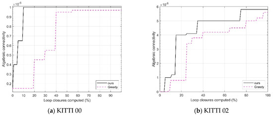 First, an algebraic connectivity experiment is conducted, which is a key metric for evaluating the performance of the pose graph. The value of algebraic connectivity reflects the degree of connectivity between nodes in the pose graph. In other words, it measures the connectivity between loop closures. A higher algebraic connectivity indicates smoother information flow between nodes, which results in higher accuracy for robot pose estimation and map construction based on the pose graph. This paper compares the algebraic connectivity of the proposed algorithm with the greedy algorithm used in reference [22]. By doing so, it is possible to intuitively see which method better optimizes the pose graph structure and enhances the overall system performance. Figure 4 shows the results of running the KITTI00 and KITTI02 sequences, gradually processing loop candidates according to the calculated loop closure percentage. For each loop closure percentage node, algebraic connectivity is recorded under both the proposed algorithm and the greedy algorithm, and the corresponding curves are plotted.