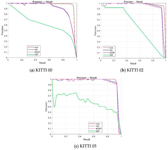 This section evaluates the loop closure detection performance using precision–recall (PR) curves, where the x axis represents recall and the y axis represents precision. The better the loop closure detection algorithm, the more the PR curve tends toward the upper right corner, indicating that the algorithm can maintain high precision even with high recall.