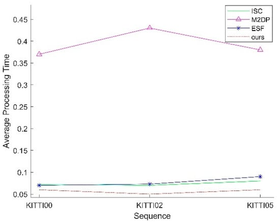 To validate the efficiency of the proposed loop closure detection algorithm, this section calculates and accumulates the processing time required for each frame, from projection to identifying the most similar candidate frame. The total processing time is then divided by the total number of frames to obtain the average processing time per frame. Figure 6 presents the average processing time per frame for different algorithms on the KITTI dataset. It can be observed that the proposed loop closure detection algorithm achieves a lower average processing time per frame compared to other algorithms.