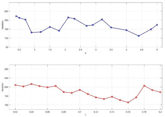 First, the values of the control parameter and the TLS cost threshold are determined based on the characteristics of the dataset environment. As shown in Figure 7 and Figure 8, for the KITTI00 and KITTI02 sequences, different combinations of and are used to record the number of iterations required to meet the termination condition. The results indicate that, in the urban road scenario of sequence 00, where lighting is heavily affected by building occlusion and scene textures are complex, setting = 1.2 and = 0.14 leads to fewer iterations. In contrast, in sequence 02, which includes varying road slopes, significant lighting changes, and dynamic interferences from vehicles and pedestrians, setting = 4.4 and = 0.16 achieves convergence in fewer iterations.