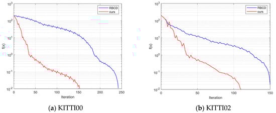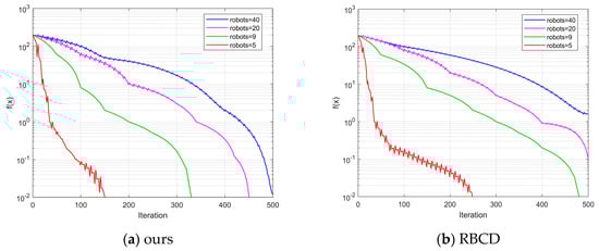 As shown in Figure 9, the back-end optimization process involving three robots is presented for the KITTI dataset. The horizontal axis represents the number of iterations, while the vertical axis indicates the difference between the objective function value and the optimal value. Experimental results reveal that the proposed improved iterative algorithm demonstrates a significant advantage in terms of the number of iterations required to converge to the optimal solution. In the KITTI00 and KITTI02 sequences, the proposed algorithm satisfies the termination criterion in fewer than 150 iterations, whereas the RBCD algorithm requires more iterations. This strongly validates the substantial improvement in convergence speed achieved by the proposed method, enabling faster pose graph optimization and enhancing the real-time performance of multi-robot systems. Figure 10 illustrates the impact of different numbers of robots on algorithm performance. As the iterations progress, the difference between the objective function value and the optimal value gradually decreases for various robot counts (5, 9, 20, 40). This demonstrates that the proposed algorithm maintains a fast iteration speed and achieves convergence across different robot configurations. In contrast, the RBCD algorithm exhibits divergence in scenarios involving a larger number of robots. Compared to the RBCD algorithm, the proposed method consistently converges with fewer iterations, maintaining both high convergence efficiency and stable solution accuracy, even in large-scale multi-robot experiments.
