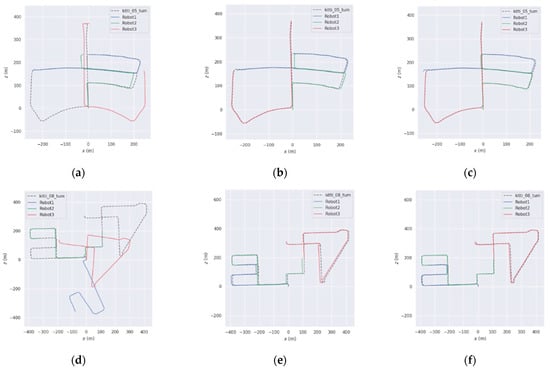 Trajectory results on KITTI sequences ((a–c) for sequence 05, (d–f) for sequence 08), (a) DiSCo-SLAM; (b) DCL-SLAM; (c) ours; (d) DiSCo-SLAM; (e) DCL-SLAM; (f) ours.