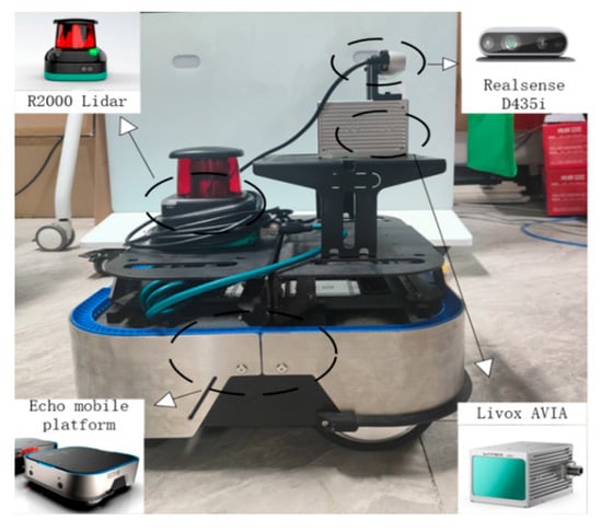 To verify the practicality of the proposed multi-robot SLAM algorithm in real-world scenarios, this section presents a vehicle-mounted experiment conducted on a university campus. During the experiment, a robot was controlled to follow a predefined trajectory while collecting data in a large-scale outdoor environment. Both single-robot and multi-robot SLAM tests were performed. The coordinate data collected using an R2000 LiDAR, which employs a retroreflector-based trilateration method with an accuracy of ±3 mm [31], were used as the ground truth reference for this experiment. The accuracy of the proposed algorithm was evaluated using the absolute trajectory error (ATE). Figure 12 presents the custom-built mobile robot data collection platform, which consists of an Echo mobile platform (Qiyuan Robotics Co. Ltd., Dongguan, China), a Livox AVIA multi-line LiDAR (DJI Technology Co. Ltd., Shenzhen, China), a Realsense D435i camera (Intel Corporation, Santa Clara, CA, USA), an IMU integrated into the camera, and an R2000 LiDAR (Pepperl+Fuchs GmbH, Mannheim, Germany). The Livox AVIA multi-line LiDAR features high resolution and a large field of view, allowing for the rapid acquisition of point cloud data over large areas. Its measurement accuracy reaches ±2 cm, providing precise geometric information for map building. The Realsense D435i camera not only captures high-quality color images but also acquires depth information. Its color image resolution is 1920 × 1080, while its depth image resolution is 1280 × 720, with a frame rate of up to 30 fps, offering rich data for visual feature extraction and loop closure detection. The camera’s built-in IMU can measure the robot’s acceleration and angular velocity in real time, providing inertial information for pose estimation, thereby enhancing the accuracy and stability of localization. The specifications of these sensors have been detailed in the previous section. The computational platform used in the experiment was an Acer (Acer Inc., Taipei, Taiwan Province, China) laptop equipped with a 12th Gen Intel® Core™ i5-12500H CPU and 16 GB of RAM. The software environment was based on Ubuntu 18.04 with the ROS Melodic framework. In this section, the network delay is set to 30–80 ms, and the packet loss rate is set to 8–12%.