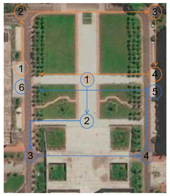 To validate the proposed multi-robot SLAM system in real-world environments, considering the limitations of sensor equipment, data collection for the multi-robot SLAM system was conducted using a single robot. The recorded data were then processed using ROS’s data recording and playback functionality, similar to the verification approach used for public datasets. The recorded dataset was divided into two sub-sequences, which were simultaneously replayed on a single device to simulate the effect of multiple robots operating concurrently. In this experiment, sensor data from the robot’s operation were collected over an area of approximately 13,000 square meters to validate the effectiveness of the proposed algorithm. To evaluate the performance of the proposed multi-robot SLAM algorithm, Table 8 presents the trajectory length information for each robot in the custom test dataset. A comparative analysis of localization trajectories between DiSCo-SLAM, DCL-SLAM, and the proposed algorithm was conducted within the custom test dataset. Figure 13 illustrates the planned trajectories of two robots, the trajectory of Robot 1 is the blue track in the figure, and the operation sequence is 1-2-3-4-5-6. The trajectory of Robot 2 is the orange track in the figure, and the operation sequence is 1-2-3-4-1, while Figure 14 presents the localization trajectory evaluation results for different algorithms. As shown in the figure, the proposed algorithm successfully completes high-quality mapping in large-scale outdoor environments, maintaining a trajectory that closely aligns with the reference trajectory with effective loop closure. The ATE results are presented in Table 9, where it is observed that DiSCo-SLAM fails due to the absence of loop closure. Compared to DCL-SLAM, the proposed algorithm achieves a 32.8% improvement in localization accuracy.
