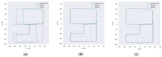 Trajectory results of the custom test dataset: (a) DiSCo-SLAM; (b) DCL-SLAM; and (c) ours.