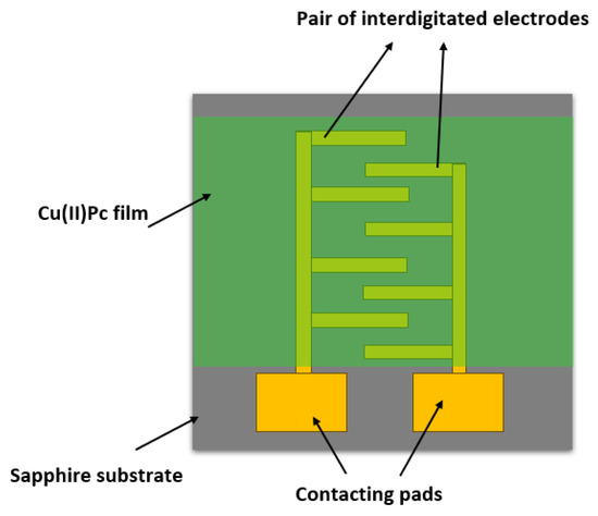 Copper(II)phthalocyanine, CuPc, was sourced from Sigma-Aldrich (Cat No. 459712), and was thermally evaporated onto a sapphire (Al2O3) supporting substrate in a high vacuum thermal evaporator (E306A, Edwards Vacuum, Crawley, England). The substrate carried interdigitated Ti/Au electrodes (n = 15 pairs with a L = 50 μm channel length and a W = 1 mm overlap, as well as a geometry factor n W/L = 15 × 1 mm/50 μm = 300). The electrode geometry is illustrated schematically in Figure 1.