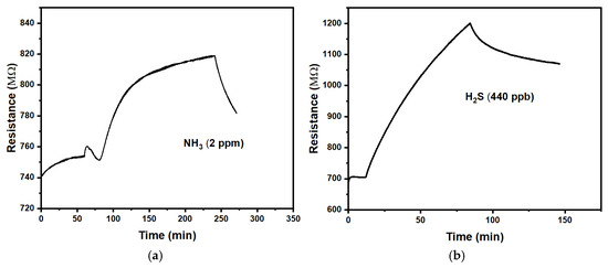 Following the exposure to 1 ppm NO2, our sensor recovers slowly when purging with clean air. Full recovery can take several hours, at least two orders of magnitude slower than the response. This is in contrast to the recovery from the exposure to NH3 and H2S, which was similarly quick as the response (cf. Figure 3). It is typical for sensors with a large response magnitude to only recover slowly, and accelerated recovery would require heating. Slow recovery is another difference to the characteristics observed by Chia et al. [15]. Their recovery after NO2 exposure was (only) ~two times slower than the response, and not two orders of magnitude slower, as with our films; however, their response to NO2 was significantly weaker.