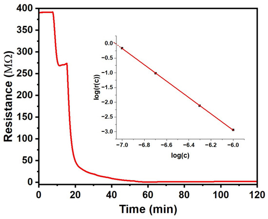 The resistance of our chemiresistors was monitored in real time under exposure to defined pollutant atmospheres using a high-resistance meter (Keithley 6517B) with an input impedance of 200 TΩ. To have a measurable resistance, the input voltage was increased to (200 to 500) V. Triaxial cables were used to connect our sensor (inside the chamber) to the High and LO Keithley 6517B inputs. The connection of Keithley’s internal ammeter and the LO of the voltage source was activated by the instrument’s software in the ‘Meter-Connect setting’. The sensor chamber and Keithley instrument were jointly grounded to avoid any parasitic effects. The film resistance prior to the gas exposure was in the order (400 to 900) MΩ. For the evaluation, data are presented as a graph resistance R vs. time t, R(t). The times at which the gas exposure begins or the gas concentration changes are indicated on the t axis. R(t) may drift somewhat even under zero exposure, and does not always immediately respond fully to gas exposure, but for a given gas concentration c, it approaches a limiting value with a response time constant τ. We define a dimensionless response r(c) as this limiting resistance value at a given concentration c of a particular gas, divided by the resistance prior to exposure, as shown in Equation (1):