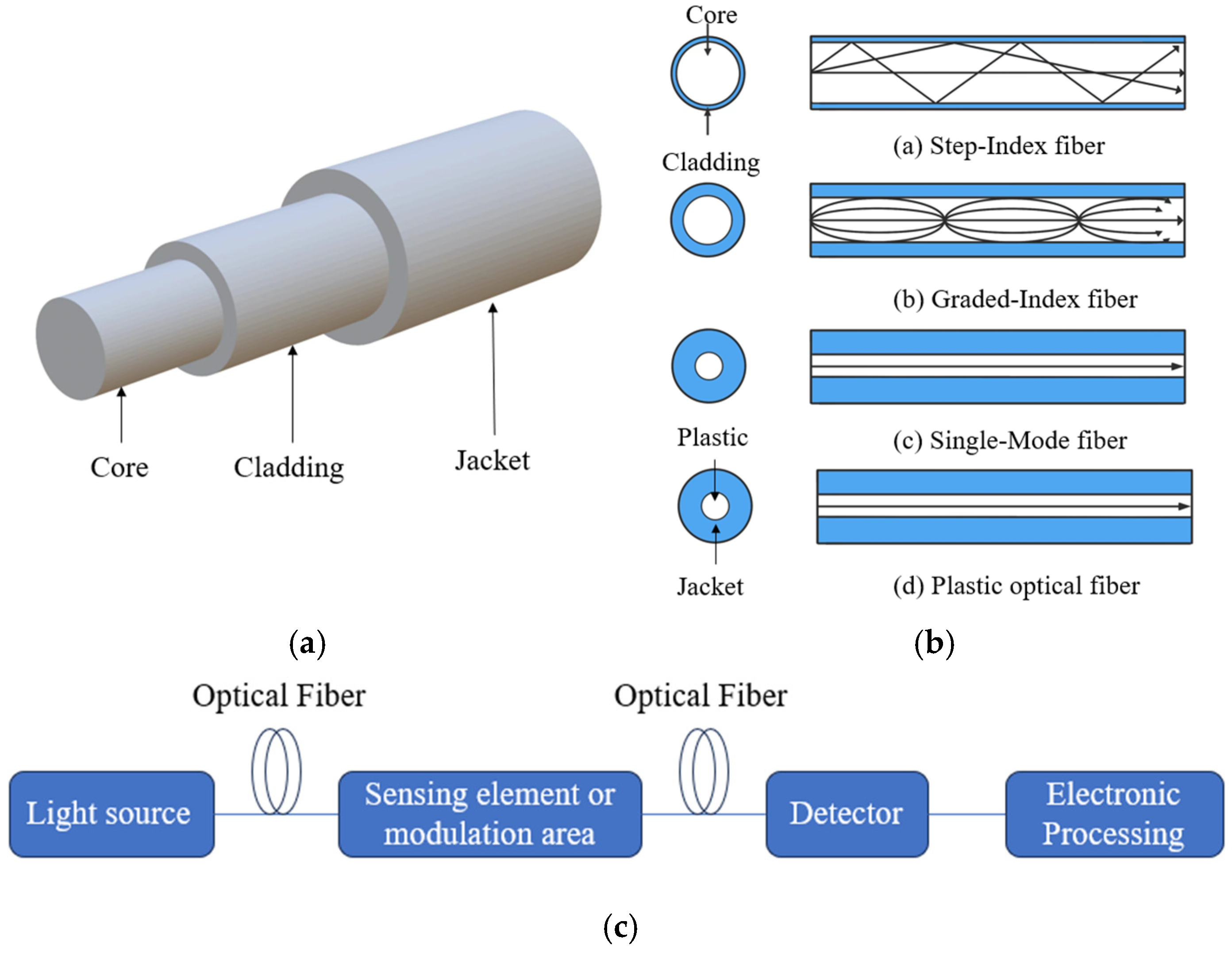 | Polarization-based | Polarization-maintaining fibers; birefringent fiber structures; fiber loop mirrors | Polarization state, birefringence, or beat length | Good sensitivity to stress, temperature, and anisotropic changes; useful for vector quantities | Requires polarization control and analysis; prone to random polarization fluctuations in non-PM fibers |