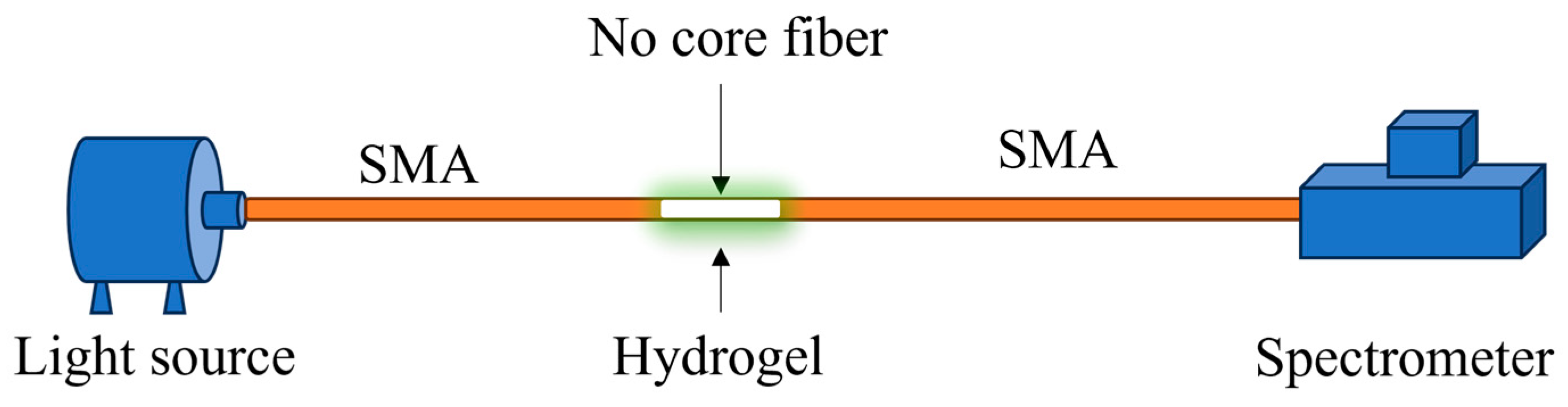 | Intensity-based | Straight or tapered fiber; side-polished fiber; dye- or indicator-coated fiber tip or segment | Transmitted, reflected, or fluorescence intensity | Simple design and readout; low-cost hardware; easy integration and miniaturization | Sensitive to source and coupling fluctuations; bending and loss variations can affect the signal |