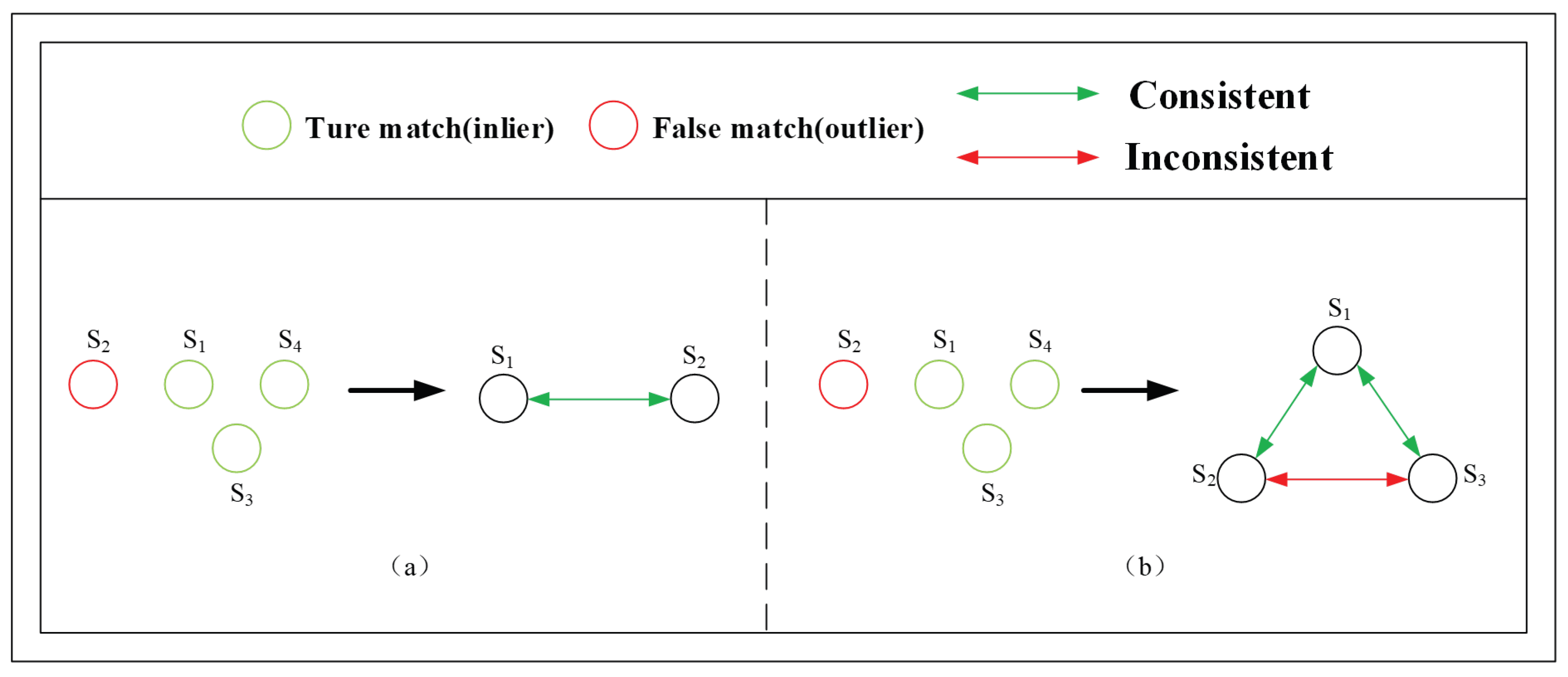 25]. In studies based on guided sampling strategies, exploiting local geometric relationships among feature points to enhance spatial consistency has become an important research direction. These algorithms leverage prior information, such as pairwise relationships and residual ordering. Pairwise relationships are widely used as a metric for inlier discrimination, based on the assumption that inliers tend to be spatially proximate while outliers are randomly distributed, thereby improving the robustness and efficiency of the sampling procedure. However, outliers may occasionally exhibit local geometric characteristics similar to those of inliers, which introduces a risk of misclassification when relying solely on pairwise relationship-based discrimination. Consequently, relying solely on pairwise relationships during sampling is often insufficient to effectively distinguish inliers from outliers, thereby reducing the robustness of model fitting.